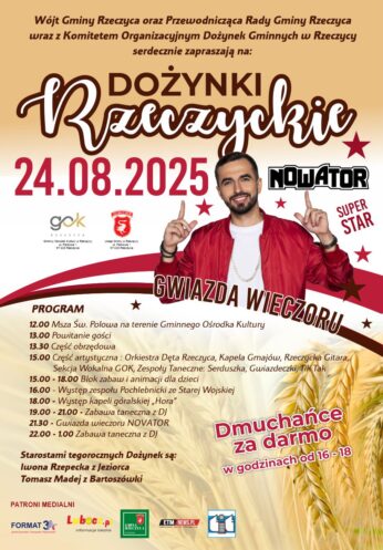 Wójt Gminy Rzeczyca, Przewodnicząca Rady Gminy Rzeczyca oraz Komitet Organizacyjny zapraszają mieszkańców i gości na tegoroczne Dożynki Gminne, które odbędą się 24 sierpnia 2025 roku na terenie Gminnego Ośrodka Kultury w Rzeczycy.