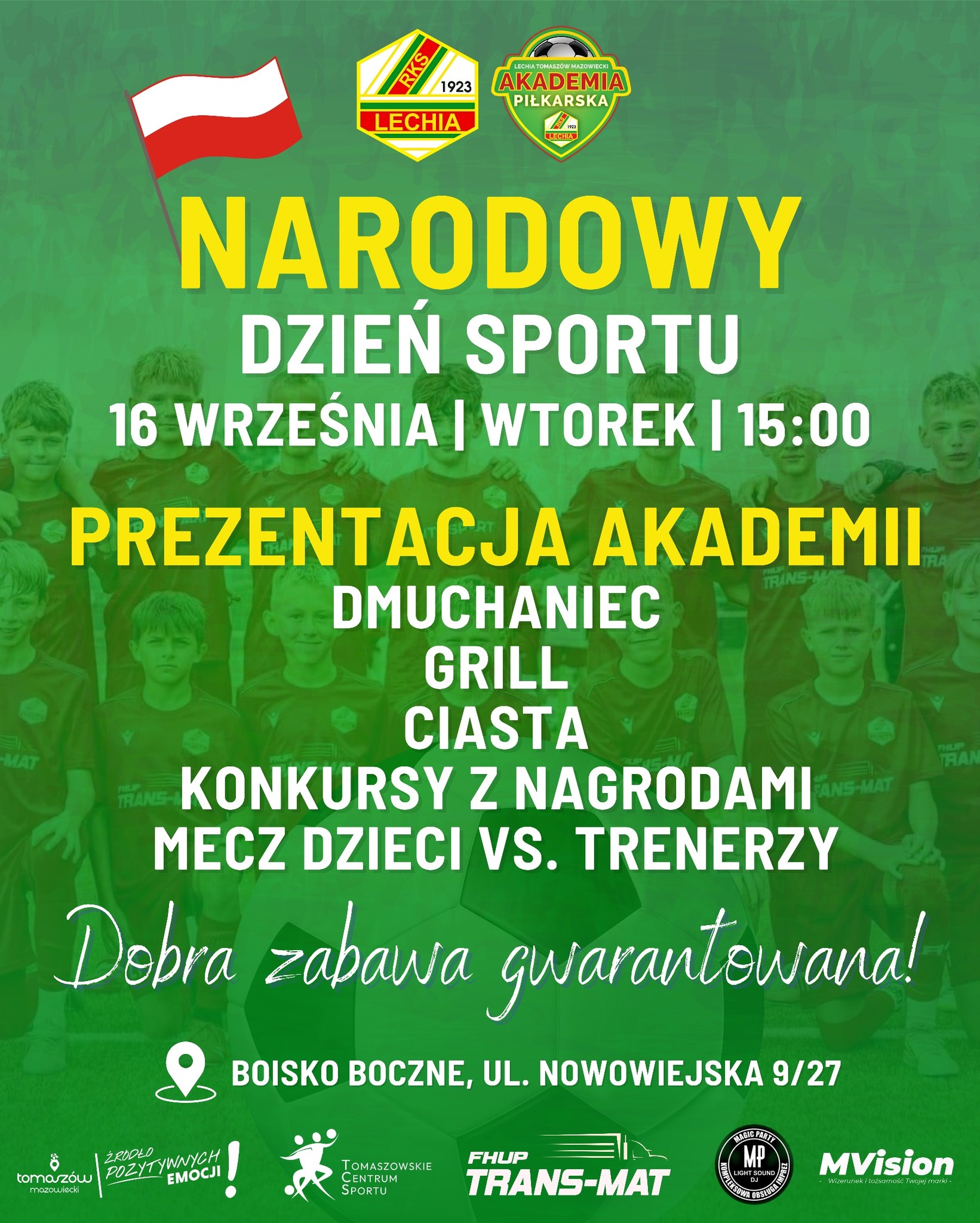 Akademia Piłkarska RKS Lechia Tomaszów zapraszam na Narodowy Dzień Sportu. To wyjątkowe, sportowe święto odbędzie się na boisku bocznym przy ul. Nowowiejskiej 5/7 już w najbliższy wtorek, 16 września o godz. 15. Na uczestników będzie czekało wiele atrakcji m.in. konkursy z nagrodami, grill, dmuchaniec i mecz Dzieci vs. Trenerzy. Organizatorzy zapewnią mnóstwo dobrej zabawy i zadbają o sportową atmosferę. Będzie można aktywnie [...]