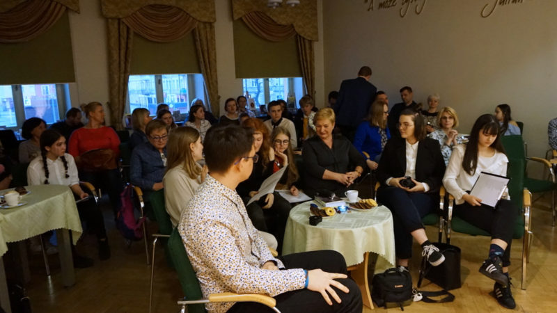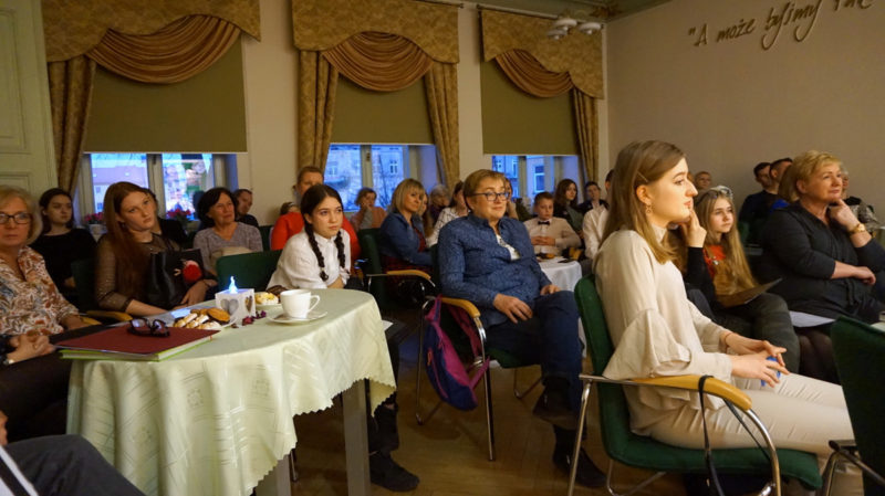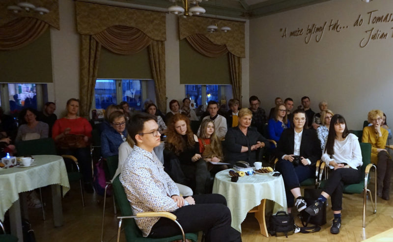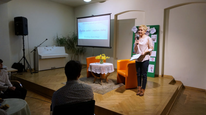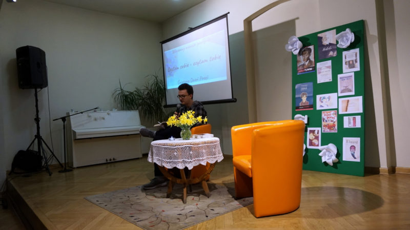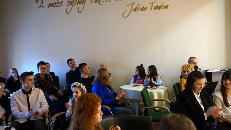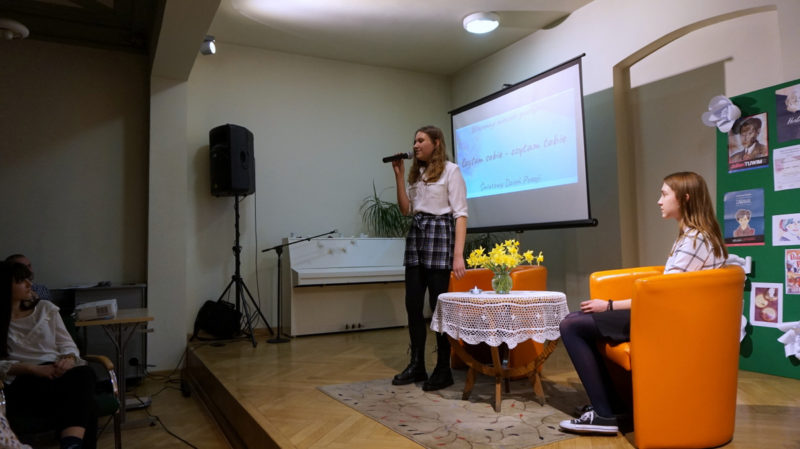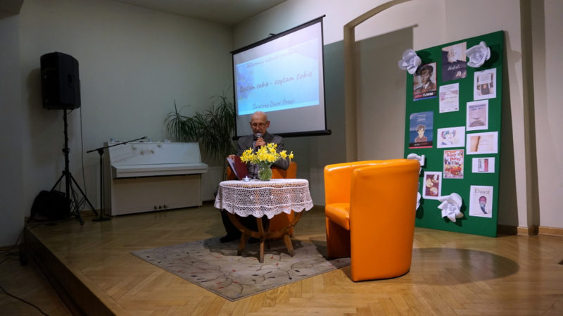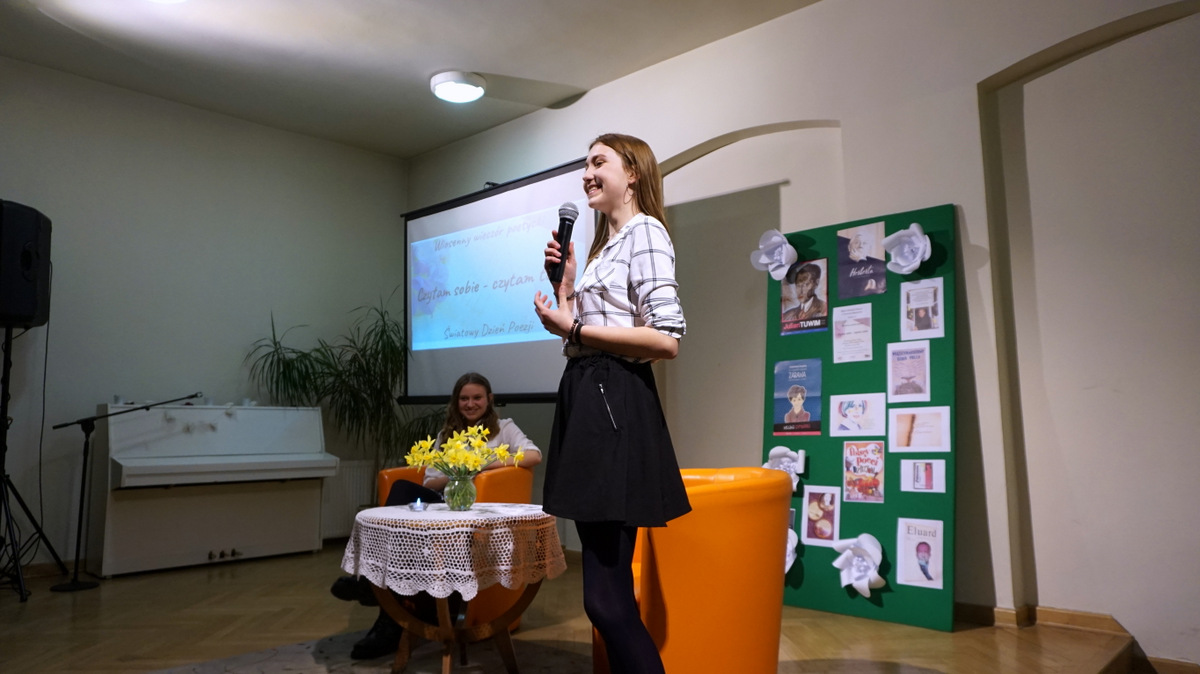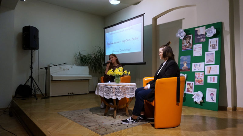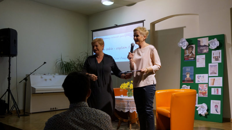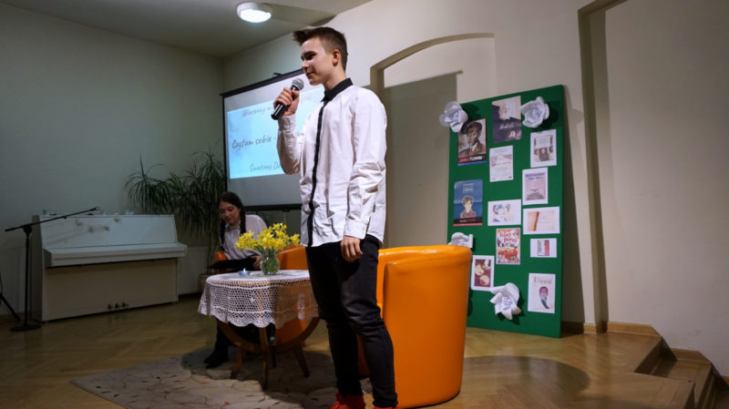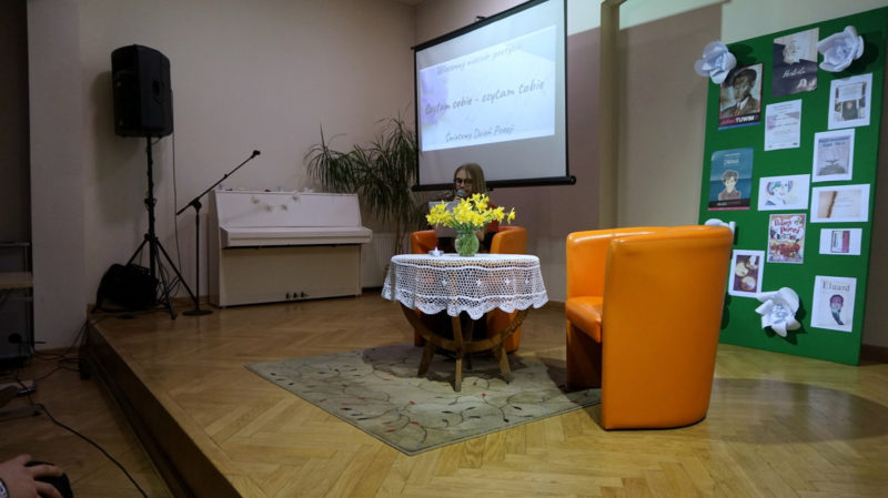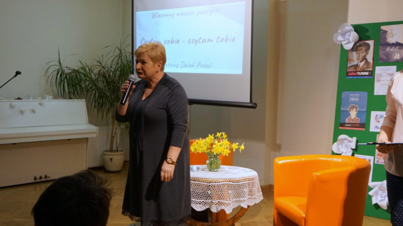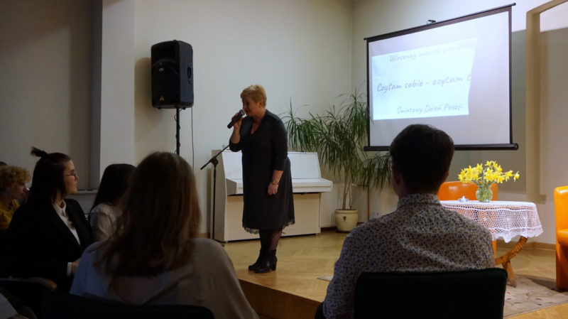 Zaproszenie do wspólnego czytania przyjęli również poeci pan Krzysztof Kleszcz i Tomasz Bąk. Dopełnieniem wieczorku poetyckiego był występ wokalny pani Barbary Kania, która wykonała utwory „Niebo do wynajęcia Roberta Kasprzyckiego, ”Wariatka tańczy i „Niech żyje bal” Agnieszki Osieckiej oraz Mai Kijewskiej uczennicy II Liceum Ogólnokształcącego.