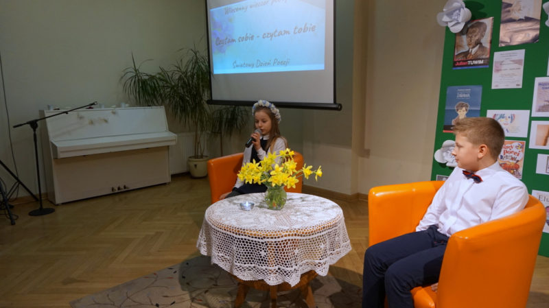 21 marca w pierwszy dzień wiosny odbyło się spotkanie miłośników poezji by uczcić Światowy Dzień Poezji. „Czytam sobie- Czytam tobie” to hasło, które było mottem spotkania w Oddziale dla Dzieci i Młodzieży Miejskiej Biblioteki Publicznej.