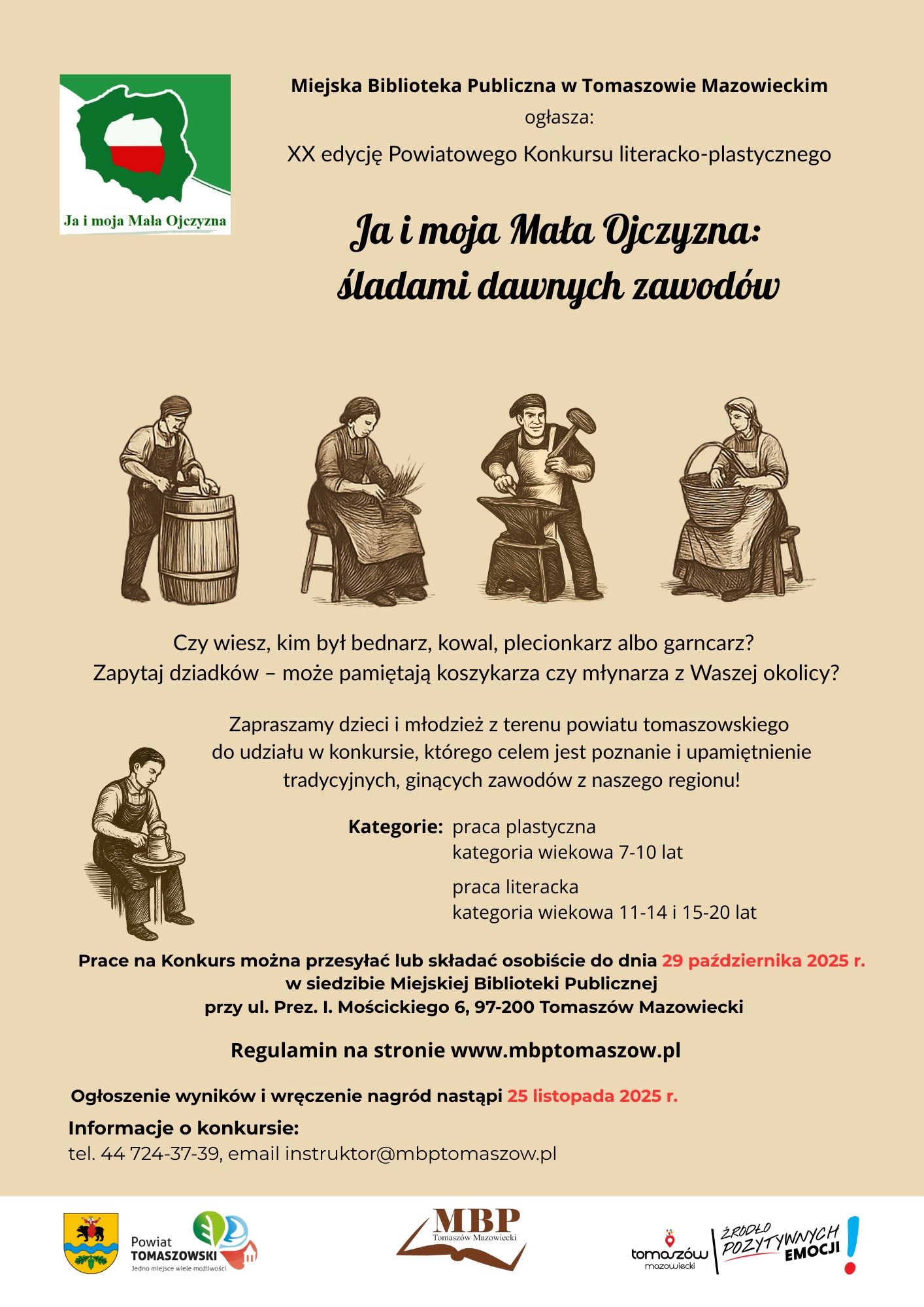 Miejska Biblioteka Publiczna w Tomaszowie Mazowieckim zaprasza uczniów szkół podstawowych i ponadpodstawowych z terenu powiatu tomaszowskiego do udziału w XX edycji Powiatowego Konkursu literacko-plastycznego „Ja i moja Mała Ojczyzna: śladami dawnych zawodów”.