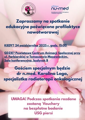 Tomaszowskie Stowarzyszenie Amazonek wraz ze Specjalistycznym Szpitalem Onkologicznym NU-MED serdecznie zapraszają na wyjątkowe spotkanie edukacyjne poświęcone profilaktyce nowotworowej. Wydarzenie odbędzie się 24 października 2025 r. o godz. 15:00 w Powiatowym Centrum Animacji Społecznej przy ul. Farbiarskiej w Tomaszowie Mazowieckim w Sali konferencyjnej w budynku B.